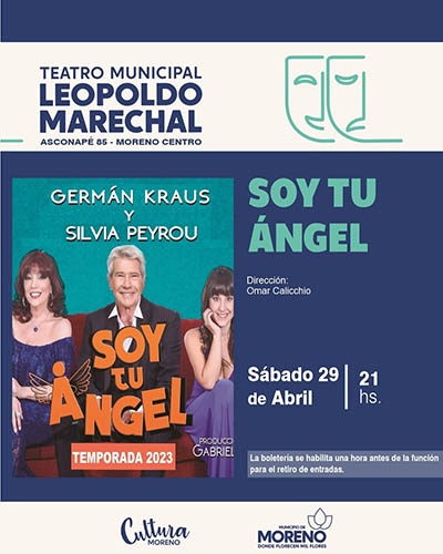 El sábado 29 de abril a las 21 horas, en el teatro Municipal “Leopoldo Marechal”, se presentará la obra “Soy tu Ángel”, bajo la dirección de Omar Calicchio. Una comedia para reír y emocionarse con la actuación de Germán Kraus, Silvia Peyrou y Bianca Lauria. La obra, escrita por Krause cuenta sobre la vida de un hombre retirado y alejado de todo y de todos después de haber conocido el éxito y la fama. Las entradas de cada una de las obras del Teatro Leopoldo Marechal son libres y gratuitas, y se retiran siempre una hora antes de la función en la puerta del mismo.