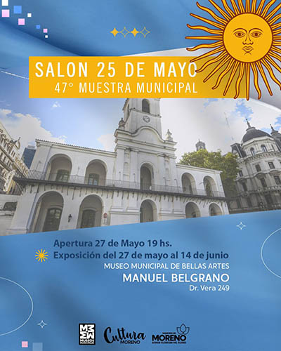 El día sábado 27, a las 19 horas, se realiza la apertura del 47° Salón Anual de Artes Plásticas “25 de Mayo”. Una muestra que cuenta con obras de diferentes artistas morenenses y estará exhibida hasta el miércoles 14 de junio inclusive. Dicha muestra se encontrará disponible en el Museo Manuel Belgrano, ubicado en la calle Dr. Vera 249.