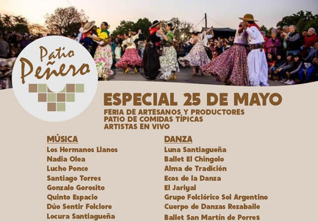 El día domingo 28 a partir de las 12 horas, se realizará “Patio Peñero, especial 25 de mayo”, en la plaza Buján, ubicada en Ruta Provincial 7 Km. 35,5, Paso del Rey. La jornada contará con la tradicional feria de artesanos, artesanas y productores, patio de comidas y presentaciones artísticas en vivo.