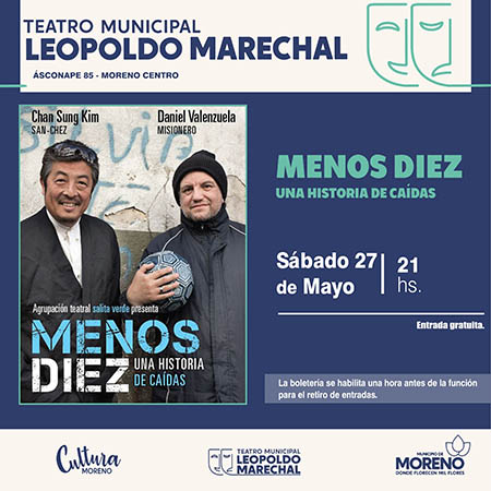 A su vez, el mismo sábado 27, a las 21 horas, se presentará la obra “Menos Diez” en el teatro Leopoldo Marechal. Con las actuaciones de los artistas Daniel Valenzuela y Chang Sung Kim, esta comedia cuenta la historia de dos amigos de la infancia, uno fue un gran futbolista en los años 70 y el otro su representante. Y luego de una vida llena de éxito y fama, las luces empiezan a apagarse para esta inseparable dupla.