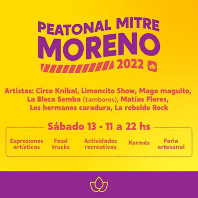 Como cada segundo sábado del mes, de 11 a 22 horas, las familias podrán recorrer la Peatonal Mitre de Moreno, para pasear y disfrutar de los mejores espectáculos del arte callejero, la Feria Artesanal y el Patio Gastronómico con propuestas para todos los gustos.