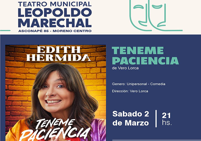 El Municipio de Moreno presentará en el teatro municipal “Leopoldo Marechal”, ubicado en Asconapé 85, la obra «Teneme paciencia”, el día sábado 2 de marzo, a las 21 horas. Entrada libre y gratuita.