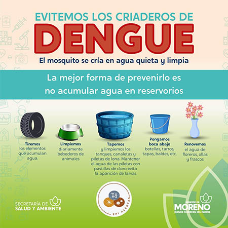 El Municipio de Moreno, a través de la Secretaría de Salud y Ambiente, recomienda a las vecinas y vecinos que, tras haber comenzado el período en el que se registran los mayores niveles de actividad del mosquito Aedes, que transmite el Dengue, Zika y Chikungunya, tomen las medidas necesarias contra esta enfermedad.