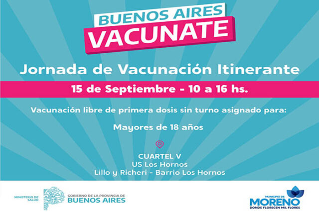 En el marco del Plan provincial público, gratuito y optativo de vacunación contra el Covid-19 “Buenos Aires Vacunate”, se realizará hoy 15 de septiembre, una jornada de vacunación itinerante en Cuartel V, destinada a mayores de 18 años.