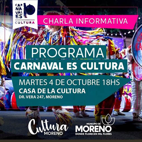 El Municipio de Moreno, a través del Programa Carnaval es Cultura, de la Secretaría de Cultura, Educación y Deporte, convoca a toda la familia murguera a participar de la charla informativa que se realizará el día martes 4 de octubre a las 18 horas, en la Casa de la Cultura, ubicada en Dr. Vera 247.