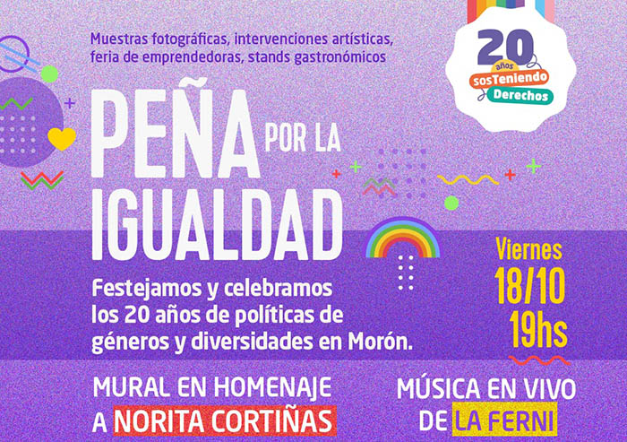 El Municipio de Morón conmemora dos décadas de trabajo en materia de género con una celebración especial: una peña por la igualdad que se llevará a cabo el próximo viernes 18 de octubre, a partir de las 19 horas, en el Centro Territorial Integral de Políticas de Género y Diversidad (La Tribuna 1881, Castelar). Este evento busca visibilizar los avances y desafíos en la lucha por la equidad de género.