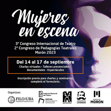 la 3ra edición del Congreso Internacional de Teatro y el 2do Congreso de Pedagogías Teatrales se realizarán desde el 14 al 17 de septiembre. Los eventos están organizados por el Municipio de Morón de la mano del Instituto de Artes del Espectáculo de la Facultad de Filosofía y Letras de la UBA; la Asociación Argentina de Mimo y Teatro Físico. Además, la actividad cuenta con el apoyo del Instituto Nacional de Teatro y el Instituto Nacional de Cine y Artes Audiovisuales. Las actividades se realizarán en el Teatro Municipal Gregorio de Laferrere (Brown y San Martín).