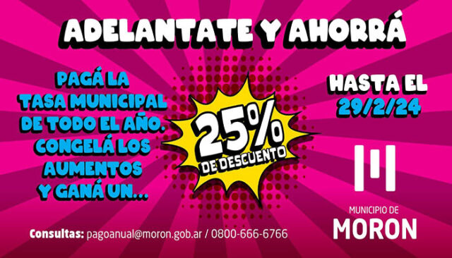El Municipio de Morón ofrece a sus vecinos y vecinas la posibilidad de realizar el pago anual de las Tasas por Servicios Generales con un descuento del 25% sobre el valor total estimado. Para acogerse al beneficio se deberá abonar antes del 29 de febrero de 2024. Además, quienes se suscriban al pago anual tendrán el beneficio de que el cálculo se les hará con la aplicación de los aumentos que ya están estipulados, sin considerarse las actualizaciones posteriores contempladas en la Ordenanza Fiscal e Impositiva.
