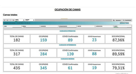 Con 89 pacientes que presentan diagnóstico confirmado de coronavirus y 23 que tienen sintomatología compatible con la enfermedad, la ocupación de camas de cuidados intensivos existentes en el distrito es del 87,4%. El registro de ayer es cinco puntos más alto que el del viernes 14 de mayo (que fue de 82,5%), pero la evolución preocupa a las autoridades municipales, ya que esta semana se amplió de 177 a 182 la cantidad de camas UTI.