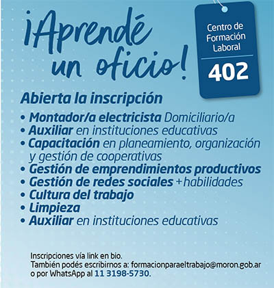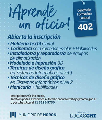 El Municipio de Morón lanzó una nueva edición de cursos de formación laboral gratuitos destinados a vecinas y vecinos del distrito. Las capacitaciones se dictarán en el Centro de Formación Laboral N° 402 y tienen como objetivo brindar herramientas concretas para la inserción laboral y el desarrollo de nuevos oficios.