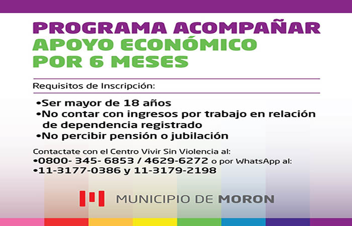 El Programa Acompañar del Ministerio de las Mujeres, Géneros y Diversidad de la Nación destina un apoyo económico, equivalente al Salario Mínimo, Vital y Móvil por 6 meses consecutivos. Está orientado a mujeres y personas de la comunidad LGTBI+ mayores de 18 años, que se encuentren atravesando situaciones de violencias por razones de género. Además, tiene como foco brindar acompañamiento integral y acceso a dispositivos de fortalecimiento psicosocial.