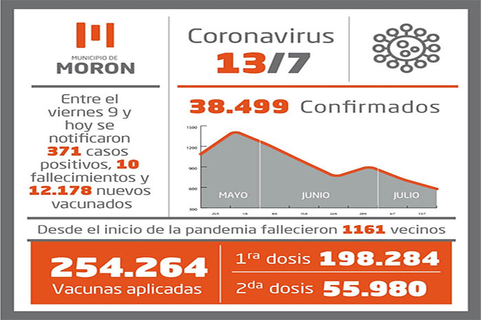 Desde el último viernes a la noche se registraron 371 casos positivos de coronavirus entre la población del distrito. Se trata de 182 mujeres y 189 hombres que elevan la cantidad de casos confirmados a 38.499; mientras que las altas médicas sumaron 549 personas y alcanzaron las 35.883 desde el inicio de la pandemia. En los últimos tres días se registraron 10 nuevos fallecimientos, cuatro mujeres de 49, 54, 57 y 71 años y seis varones de 57, 65, 76, 77 y 92 años por lo que actualmente los moronenses que murieron como consecuencia del Covid-19 son 1.161.
