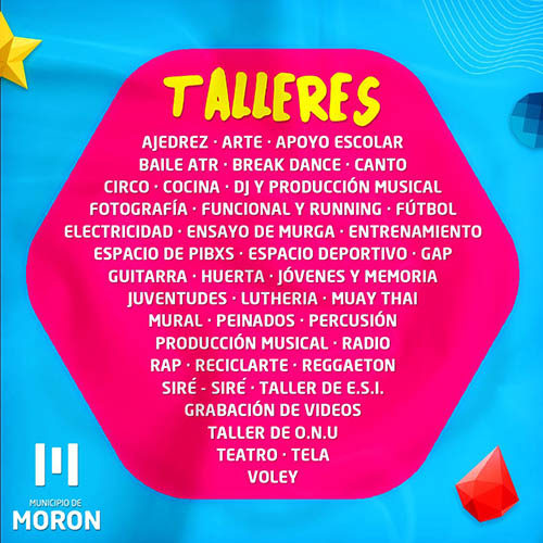La amplia propuesta cuenta con talleres de ajedrez, arte, apoyo escolar, baile ATR, canto, circo, cocina, Dj y producción musical, fotografía, entrenamiento funcional y running, fútbol, electricidad, murga, espacio de pibxs, guitarra, huerta, espacio del programa Jóvenes y Memoria, lutheria, muay thai, mural, percusión, radio, RAP, reggeton, taller de ESI, grabación de vídeos, teatro, tela y vóley, entre otras.