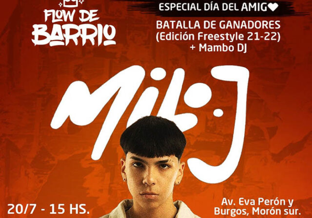 El cierre estará a cargo del artista moronense Milo J. El festival se llevará a cabo en la Av. Eva Perón 2200 (Morón Sur) y comenzará a la 15:30 con la propuesta Flow De Barrio en la que se desarrollan competencias de freestyle con participantes de la liga municipal y un set de música de la mano de Mambo DJ.