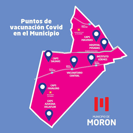 De acuerdo a lo dispuesto por el Gobierno local, los siguientes Centros de Salud y el Vacunatorio Municipal son los lugares adonde se puede recibir la vacuna contra el Covid-19, de lunes a viernes: CAPS Azucena Villaflor (Vinara 2237, Morón sur) de 11 a 16; CAPS Dr. Jorge Luis Salinas (Pergamino 1869, Castelar norte) de 9 a 14; CAPS René Favaloro (Av. Figueroa Alcorta y Nicolás Granada, Castelar sur) de 8:30 a 13:30; y el CAPS Malvinas Argentinas (Namucurá y Marconi, El Palomar), de 8:30 a 13:30. Mientras que el Vacunatorio Central Morón (Boatti 3), aplicará dosis de 12 a 18.