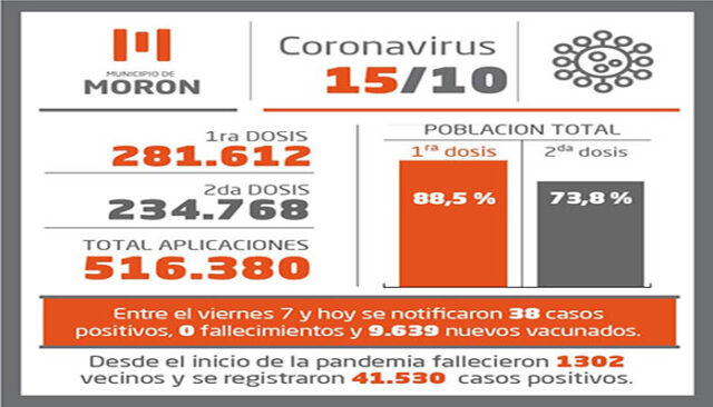 Desde el último viernes a la noche se registraron 38 casos positivos de coronavirus entre la población del distrito, que llevan el número de confirmados a 41.530; mientras que las altas médicas sumaron 35 personas y alcanzaron las 40.385 desde el inicio de la pandemia. En las últimas dos semanas no se registraron fallecimientos, por lo que actualmente los moronenses que murieron como consecuencia del Covid-19 son 1.302.