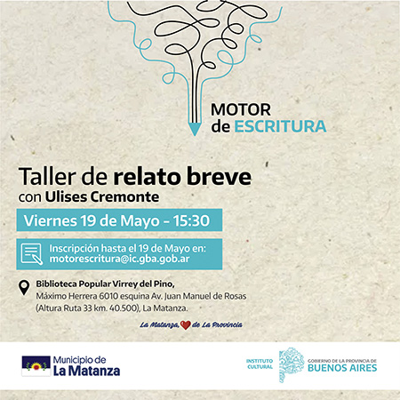 El Taller de Relatos Breves se llevará a cabo en la Biblioteca Popular de Virrey del Pino, el próximo viernes 19 de mayo, a las 15:30 horas, en Máximo Herrera 6010 esquina Avenida Juan Manuel de Rosas. Actividad que requiere inscripción previa a través del siguiente formulario: t.ly/60Ts