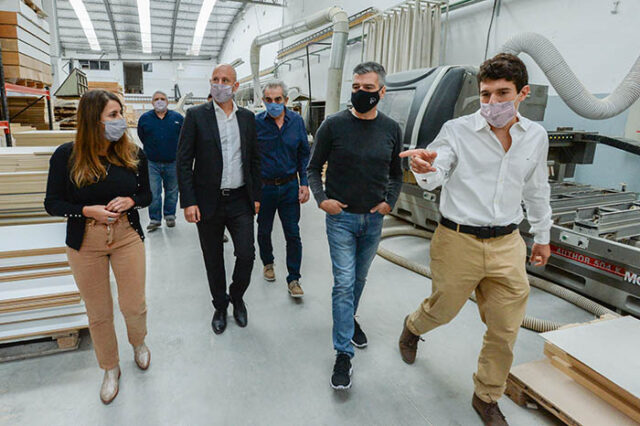 El intendente de Hurlingham, Juan Zabaleta y el secretario de la Pequeña y Mediana Empresa y los Emprendedores de la Nación, Guillermo Merediz, recorrieron la empresa de muebles de Hurlingham Estilo Artesanal, que recibió un crédito directo del Fondo Nacional de Desarrollo Productivo (FONDEP) para incorporar una nueva línea de embalaje con el objetivo de exportar a Chile y Uruguay. Además, estuvieron presentes representantes de la fábrica de pinturas del distrito Megalux, que recibió un Aporte No Reembolsable del Programa de Apoyo a la Competitividad para mejorar su proceso productivo.