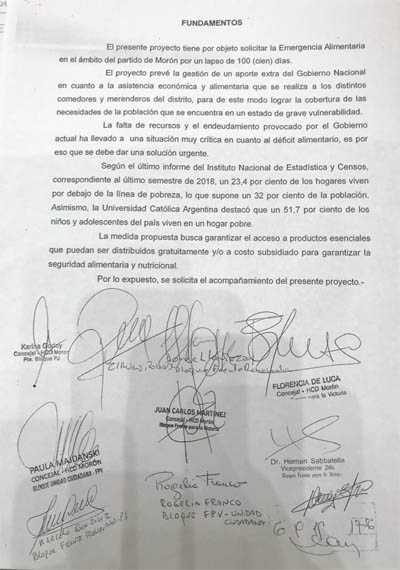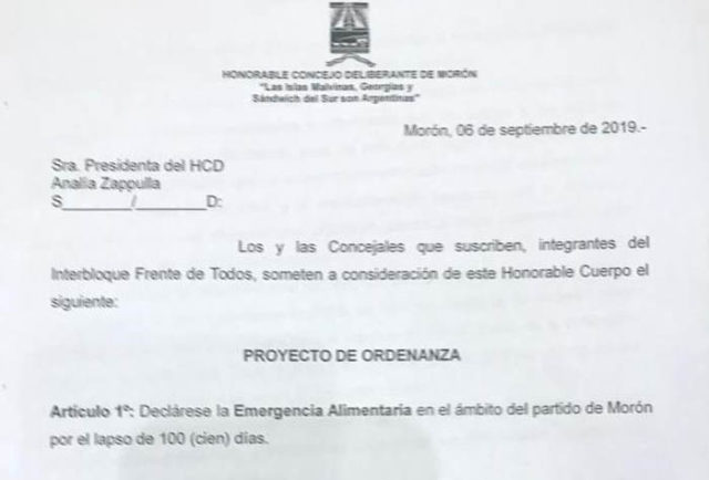 El interbloque del Frente de Todos presentó un proyecto para que se declare la Emergencia Alimentaria en Morón por un plazo de 100 días. La iniciativa tiene como objetivo garantizar el acceso a una alimentación saludable para todos los vecinos y vecinas de Morón y en particular a la población más vulnerable del distrito.