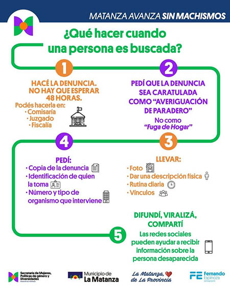La Secretaría de Mujeres, Políticas de Género y Diversidades de la Municipalidad de La Matanza informa a los vecinos del programa “Si las buscamos, no desaparecen”. Este programa articula con distintas áreas y organismos para buscar solución cuando una niña, adolescente, mujer o disidencia, por distintos motivos, se ausenta de su hogar.
