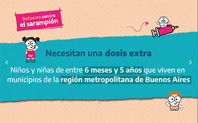 Debido al brote actual de sarampión, desde el 7 de abril niños y niñas de 6 meses a 5 años, que viven en municipios de la región metropolitana de Buenos Aires, deben recibir un refuerzo de vacunación para estar protegidos/as.