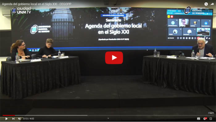 En primer lugar, Valeria Serafinoff, docente-investigadora de la Universidad Nacional de General Sarmiento (UNGS), expuso sobre políticas públicas. A continuación, la docente-investigadora de la UNM, Belén Aenlle, presentó su investigación sobre políticas sociales para el desarrollo de las comunidades. Más tarde, Claudia Bernazza, miembro del Instituto Patria, desarrolló un análisis crítico de los modelos de desarrollo local. Luego, Beatriz Árias, Directora Académica del Centro de Estudios para el Desarrollo Territorial (CEDET), planteó herramientas para pensar el desarrollo estratégico del territorio en el gobierno local. Para finalizar, el docente de la UNM Alejandro Otero expuso sobre la temática de las administraciones tributarias locales.