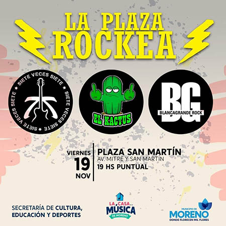 En tanto, “La Plaza Rockea” tiene como fin brindar un espacio a las bandas locales de Rock para que puedan seguir creciendo y difundiendo su arte. En esta primera fecha estarán presentes: “7 Veces 7”; “Blancagrande” y “El Kactus”