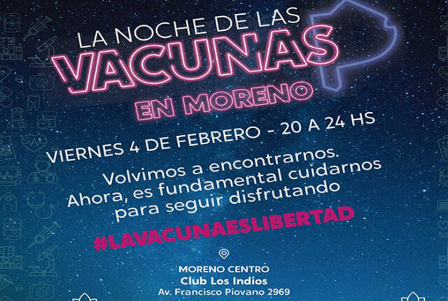 El municipio de Moreno junto al gobierno de la Provincia, llevarán adelante la campaña Buenos Aires Vacunate durante la noche de este viernes 4 de febrero para aplicar primera dosis, segunda y refuerzos sin turno.