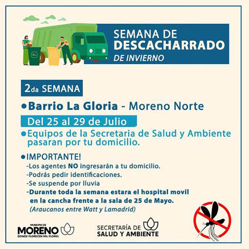en el marco de las acciones contra el dengue que impulsa el Municipio de Moreno a través de la Secretaría de Salud y Ambiente, esta semana junto al Ministerio de Salud de la Provincia, se lleva adelante una actividad de promoción de descacharrado de invierno en el Barrio La Gloria bajo el lema “Sin Aedes no hay dengue”.