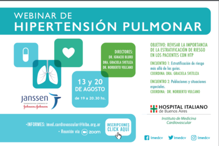 El Instituto de Medicina Cardiovascular del Hospital Italiano de Buenos realizará un simposio sobre “Hipertensión Pulmonar”, el jueves 13 y 20 de agosto a las 19 horas por plataforma virtual Zoom.