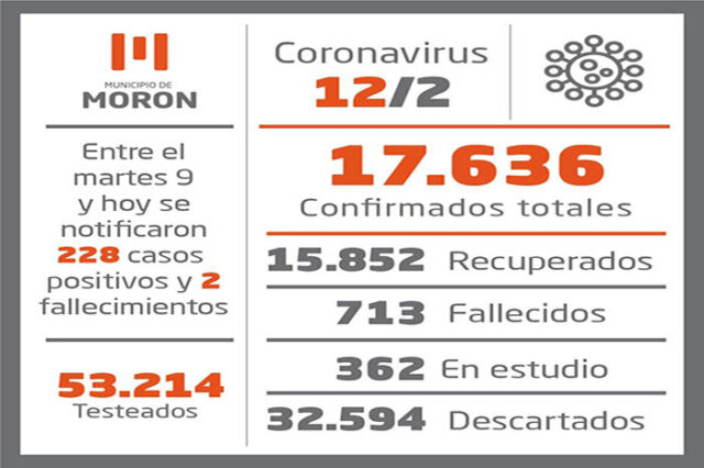 El Municipio de Morón dio a conocer que en los últimos tres días se notificaron 228 casos positivos de coronavirus (118 mujeres y 110 hombres). De los 17.636 moronenses que contrajeron la enfermedad, 15.852 se recuperaron desde el inicio de la pandemia y 713 fallecieron (un hombre y una mujer fueron comunicados desde la noche del último martes).