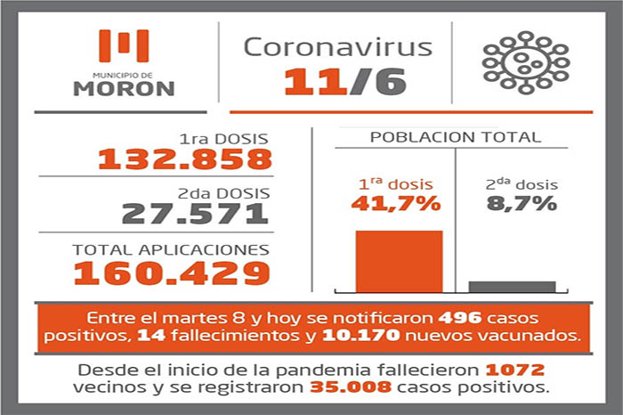 Desde el último martes a la noche se registraron 496 casos positivos de coronavirus entre la población del distrito. Se trata de 245 mujeres y 251 hombres que elevan la cantidad de casos confirmados a 35.008; mientras que las altas médicas sumaron 564 personas y alcanzaron las 31.799 desde el inicio de la pandemia. En los últimos tres días se registraron 14 nuevos fallecimientos, 5 mujeres de 54, 68, 68, 70 y 73 años y 10 varones de 41, 55, 57, 68, 76, 78, 79, 91 y 93 años por lo que actualmente los moronenses que murieron como consecuencia del Covid-19 son 1072.