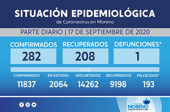 En el Municipio de Moreno hay 282 nuevos casos confirmados, 208 casos recuperados y una defunción. En total suman 11837 casos confirmados, 2064 casos sospechosos y 14262 casos descartados.