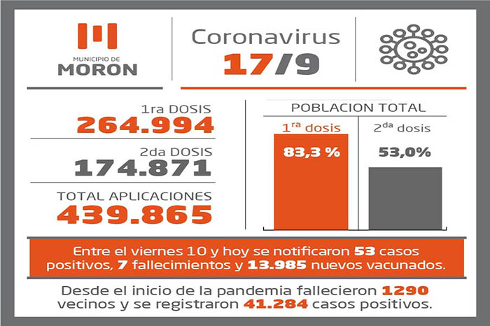 Desde el último viernes a hoy, se registraron 53 casos positivos de coronavirus entre la población del distrito, que elevan la cantidad de casos confirmados a 41.284; mientras que las altas médicas sumaron 239 personas y alcanzaron las 39.964 desde el inicio de la pandemia. En la última semana se registraron 7 nuevos fallecimientos, por lo que actualmente los moronenses que murieron como consecuencia del Covid-19 son 1.290.