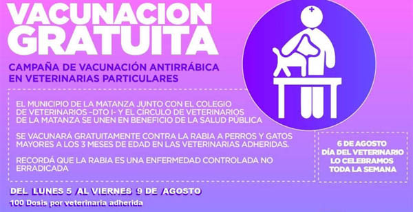 Del 5 al 9 de agosto se va a realizar en todas las localidades de La Matanza una campaña de vacunación antirrábica gratuita, en el marco de un acuerdo que firmaron la Secretaría de Salud con el Círculo de Veterinarios del municipio y el distrito I del Colegio de Veterinarios de la Provincia, en el marco del Día del Veterinario.
