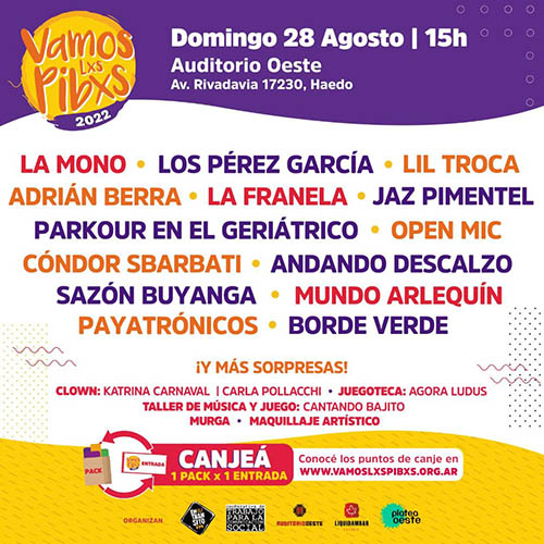 vamos Lxs Pibxs es un festival que se gestiona y realiza de manera solidaria y cooperativa a beneficio de los pibes y pibas del Oeste. Como cada año participarán bandas de gran trayectoria y locales y habrá propuestas artísticas para toda la familia: juegos, clowns, teatro, pintura y mucho más.