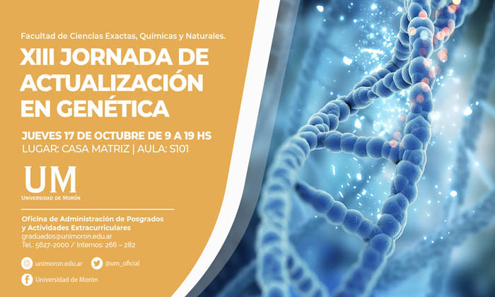 El próximo jueves 17 de octubre se llevará a cabo en la Universidad de Morón (UM), la XIII Jornada de Actualización en Genética “Bioinformática Aplicada”, organizada por la Facultad de Ciencias Exactas, Químicas y Naturales.